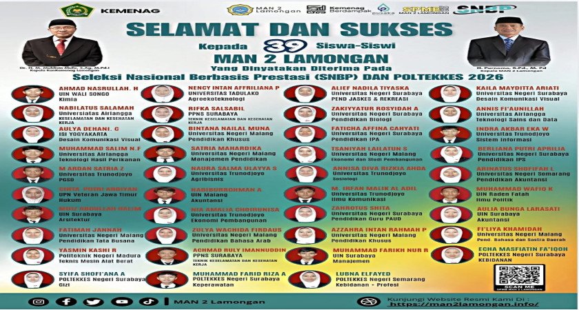 LAMONGAN – Madrasah Aliyah Negeri (MAN) 2 Lamongan kembali menorehkan prestasi membanggakan di bidang akademik. Sebanyak 19 siswa-siswi dinyatakan resmi diterima di